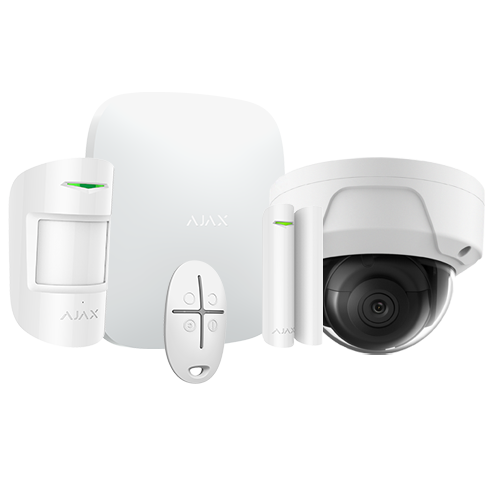 El kit incluye el panel de control Ajax Hub, un contacto magnético AJ-DOORPROTECT-W, un detector de movimiento AJ-MOTIONPROTECT-W, un mando a distancia AJ-SPACECONTROL-W y la cámara IP WiFi SAFIRE SF-IPDM934WH-2W.